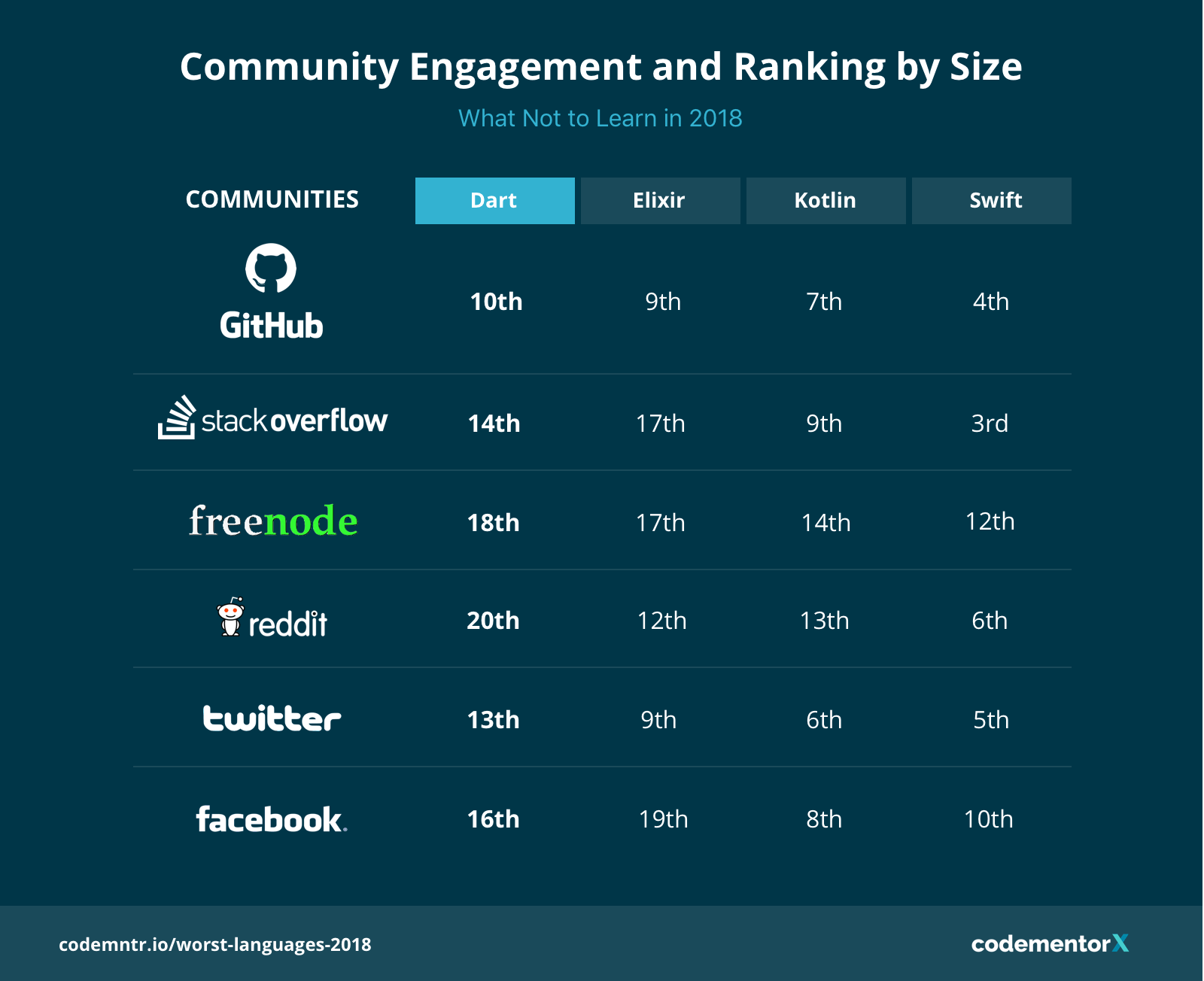 These are only the fastest programs... Javascript is ranked 9th while dart is ranked 29th. Facebook is the pioneer in writing the react and the react native framework that they used internally, but there are many other big companies that use javascript, including instagram, reddit, ebay, slack, airbnb, etc. But on the other hand, dart is gaining momentum … Dart was born in google, so … Look at the other programs. Comparing dart with javascript is much easier than comparing javascript with blazor since dart has established itself by now.